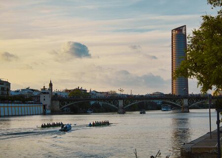 Sunset landscape on the Guadalquivir river in Seville, with rowing boats on the river and reflections of buildings in the water. Spain.