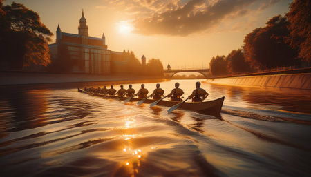 A breathtaking view of a synchronized team of rowers gliding smoothly over tranquil waters, capturing the essence of teamwork and athleticism during dawn or sunset.