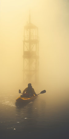 a man in a kayak navigates through the open water, surrounded by a misty and gothic atmosphere. the scene is reminiscent of industrial urban landscapes, with a frequent use of yellow tones. the influence of chicago imagists is evident, as well as the smokey background and flickr-like light installations. ai generated