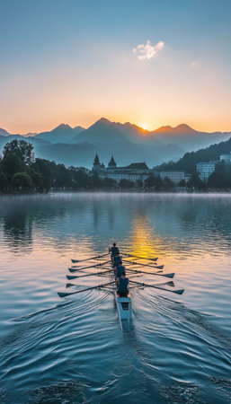 A dynamic scene capturing a rowing team in action during a stunning sunset on calm water. The vibrant sky reflects on the lake, showcasing the spirit of teamwork and athleticism.