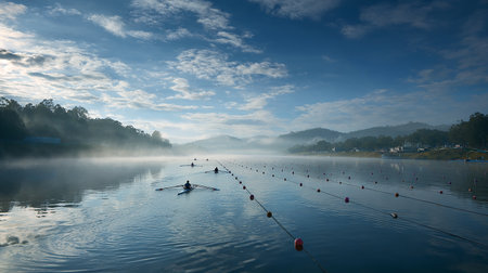 A rowing team coordinates their strokes in a scull on a calm river during a misty sunrise. The symmetrical perspective captures the teamwork and athletic discipline required in the sport against a beautiful morning backdrop.