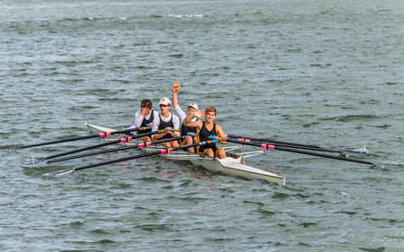 BOSTON - OCTOBER 23: South Niagara Rowing Club youth men Eights races in the Head of Charles Regatta. Marin Rowing Association won with a time of 15:06 on October 23, 2011 in Boston, MA.