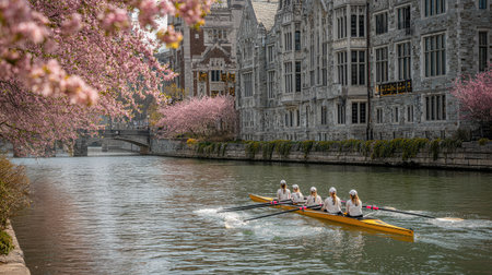A rowing team glides across a calm river, framed by blossoming trees and grand, historic buildings. The image showcases soft, natural lighting, highlighting the serene water and the team's synchronized movement. This scene could be used for various commercial projects related to sports, travel, or educational themes.