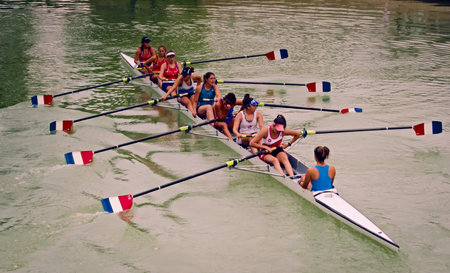 Sabaudia, Italy - April 18, 2015: a rowing team performs a morning workout in the lake of Paola. Lake Paola also called Laguna Sabaudia or Sabaudia lake is a brackish lake in the coastal provinces of Latina in the Circeo National Park