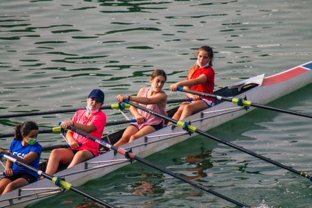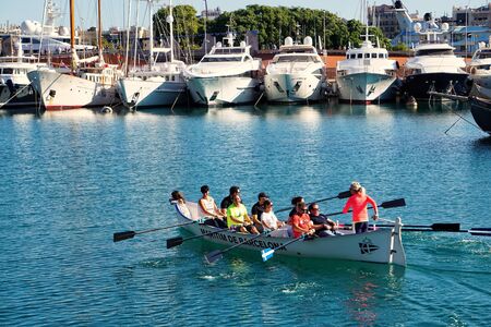 Barcelona, Spain - 26th October 2019: One rowing team in the Port of Barcelona, with a lot of boats at the background