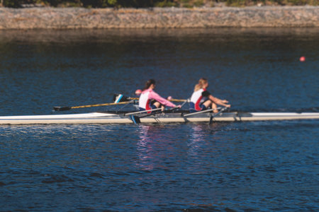 Two athletes row in harmony on a calm lake, their synchronized movement creating ripples in the clear water under bright sunlight.