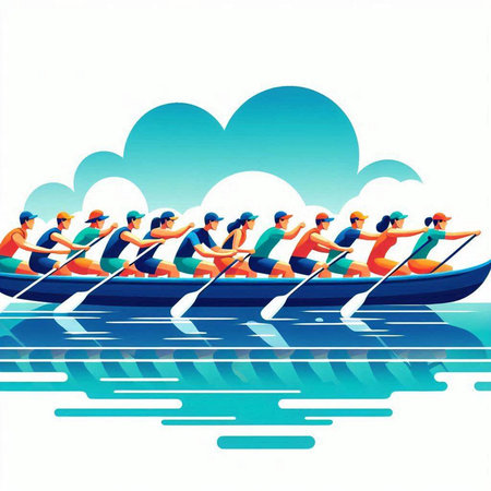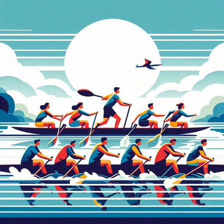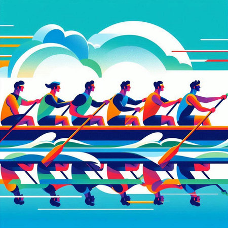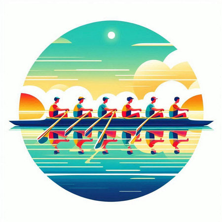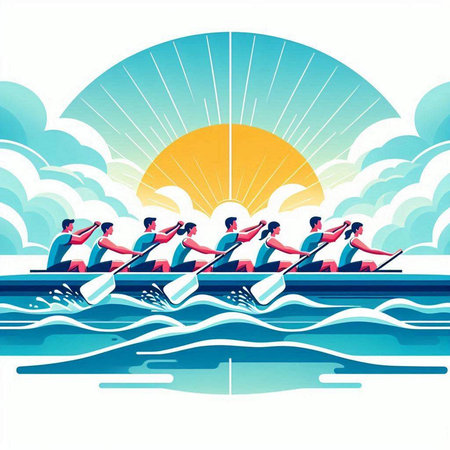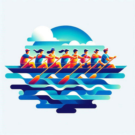 Group of people rowing on a rowboat. Vector illustration.