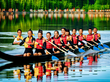 Rowing team silently paddling on a calm lake, their silhouettes visible against the vibrant orange sky and reflected sun during a beautiful sunset, symbolizing teamwork and effort