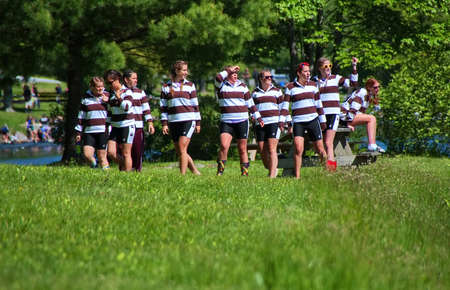 New Preston, CT USA. May 2010. Crew rowing members from Stonington High School on break cheering on racing teammates.