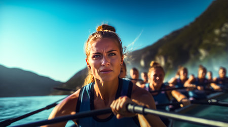 Four women rowing on the tranquil lake