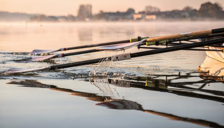 A group of rowers moves smoothly on a tranquil river as the sun rises, casting colorful reflections on the water.