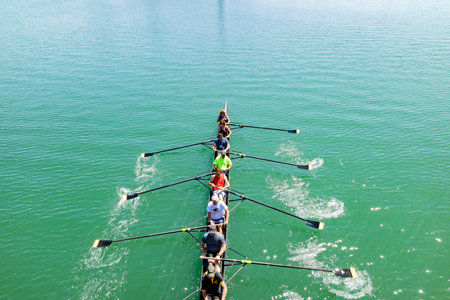 rowing team paddles on the tranquil sea. High quality photo