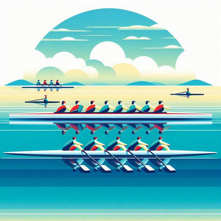 Rowing team with rowing boats in the sea, vector illustration