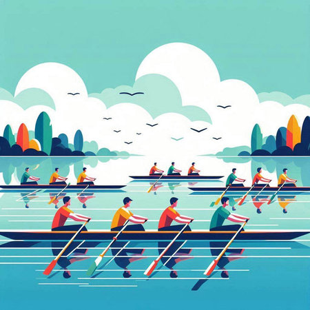 Group of people rowing in the lake. Vector Illustration.