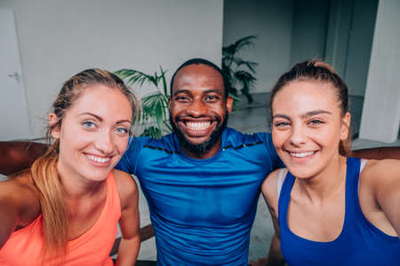 Two sporty girl and their afro american personal trainer are taking a selfie photo with mobile phone at gym