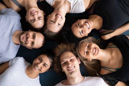 Above top view of seven multi-ethnic young happy people in sportswear lying in circle smile look at camera, rest after work out yoga class, friendship, club instructors team building activity concept