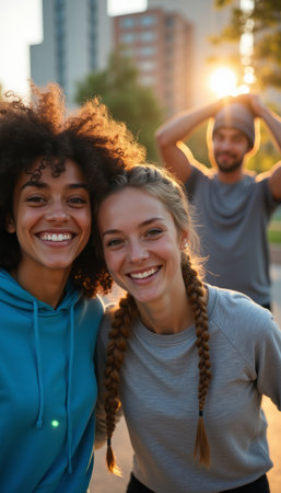 Two young women, one with curly hair and the other with braids, smile brightly in a sunlit park, while a man stretches in the background. Their laughter and camaraderie radiate warmth, capturing the essence of friendship and outdoor fun.