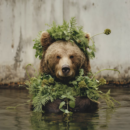 a large brown bear gracefully rides the waves in the crystal-clear waters of a tropical island. this stunning photograph captures the bear's powerful presence and intense facial expression. with its detailed atmospheric portrayal and dark, gritty aesthetic, the image resembles the style of ivan shishkin's artwork. the macro photography showcases every intricate detail, while the 8k resolution ensures a truly immersive viewing experience. ai generated