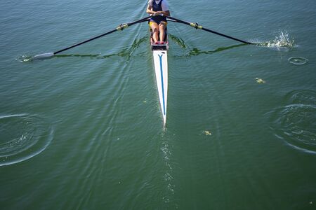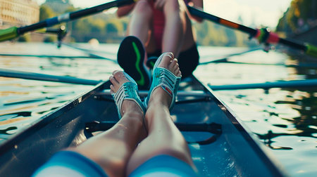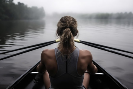 rearview shot of an unrecognizable young rower sitting in the boat ready to race, created with generative ai
