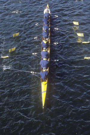 View from above of an octuple racing shell boat crew rowing.