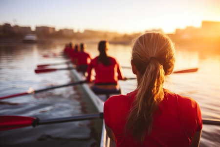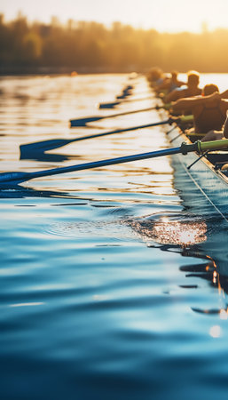 A breathtaking view of a synchronized team of rowers gliding smoothly over tranquil waters, capturing the essence of teamwork and athleticism during dawn or sunset.