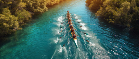 Synchronized rowers in competitive regatta with perfect water splashes in a harmonious scene