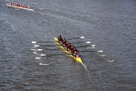 BOSTON - OCTOBER 23: South Niagara Rowing Club youth men Eights races in the Head of Charles Regatta. Marin Rowing Association won with a time of 15:06 on October 23, 2011 in Boston, MA.