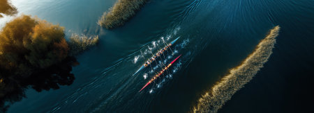 Rowers in sleek canoes glide through shimmering water, creating mesmerizing pattern. sunlight reflects off surface, enhancing serene atmosphere of teamwork and dedication