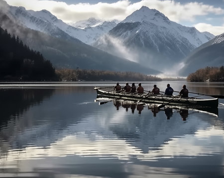 Rowing team synchronizing their strokes on a calm lake