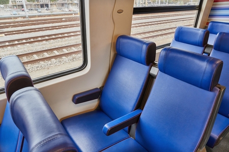 Abstract blurred Interior of a passenger car background. Travel concept with public train transport.