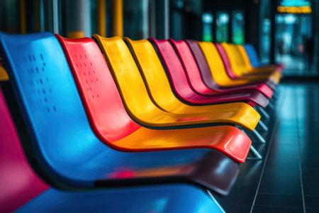 Brightly colored passenger seats arranged in rows at a public space, evoking readiness and structured modern infrastructure.