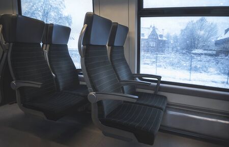Eco-friendly public transport image with comfortable train seats and window view with snowy scenery. Winter traveling. German modern train interior.