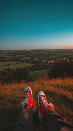 A person's red sneakers are featured in the foreground, set against a scenic panorama of rolling hills and a distant town. The composition is framed by a twilight sky, with hints of orange and blue. It captures an outdoor scene, possibly suitable for travel or lifestyle content, or similar commercial applications.