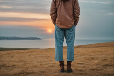 A man in a brown jacket and jeans stands on a hill and looks at the sunset.