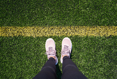 Legs of a woman standing on a green sports playground in front of a yellow line, top view