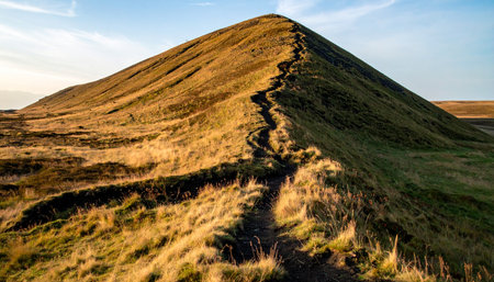 A narrow, well-trodden path carves its way up the golden-lit ridge of a grassy hill, leading directly to the summit.