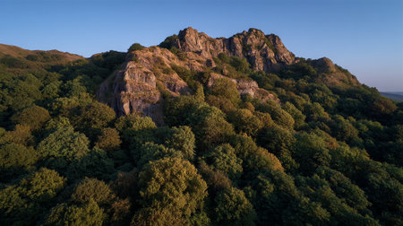 Rocky Peak Landscape: Sunlight Shines on Green Forest and Stone Cliffs