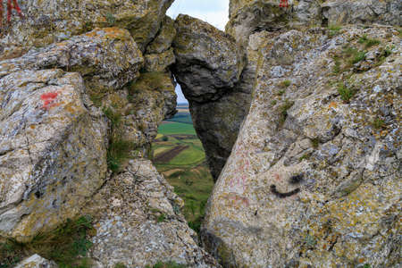 Wild rocky and mountainous nature of Eastern Europe. Landscape background with copy space for text. Selective focus, toned. Corjeuti village, welcome to Moldova.
