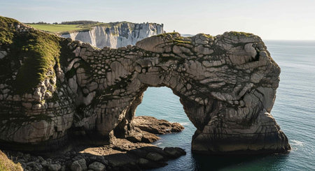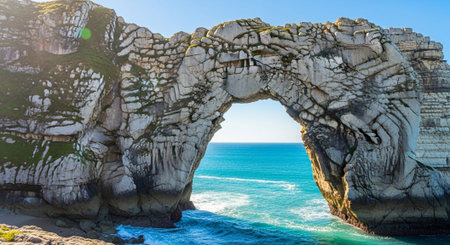 Aerial view of rugged coastal cliffs surrounded by deep blue ocean waves. The rocky formations are covered with green vegetation, creating a striking contrast against the water. The scene captures the beauty of nature and the power of the sea.