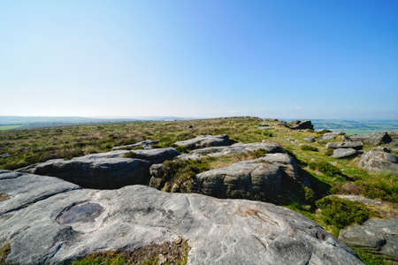 Large slabs of weathered gritstone are scattered along the top of Baslow Edge on a hazy summer morning