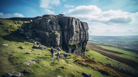the crag in yorkshire stands majestically, its rugged surface weathered by time, surrounded by lush greenery and picturesque villages, offering breathtaking views of the rolling hills and valleys, a haven for hikers, climbers, and nature enthusiasts seeking adventure in the heart of england's countryside. ai generated