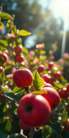 Vibrant red apples on lush green branches in a sunny orchard during late afternoon