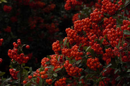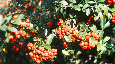 Rowanberries sour but rich vitamin C. Pyracantha plant, also known as firethorn in a garden in a sunny autumn day, beautiful outdoor floral background photographed with soft focus