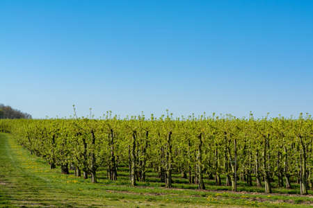 Spring landscape with fields, orchards and roads in Haspengouw region, Limburg, Belgium in sunny day