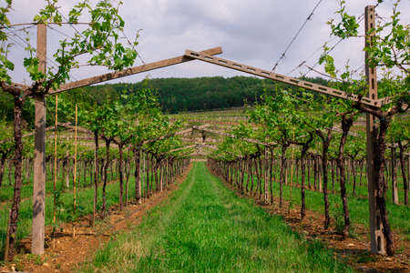 View of the vineyard during warm and sunny weather near Kyjov, South Moravia, Czech Republic. Grape field growing for wine.
