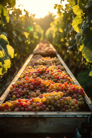 Fresh grapes on vineyard conveyor, soft sunlight, shallow depth of field, warm tones, vines in background