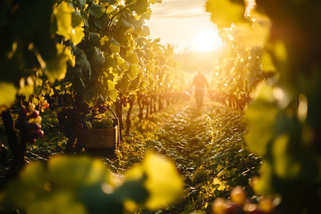 Warm golden sunlight sets over a picturesque vineyard, highlighting lush rows of grapevines in the serene countryside.