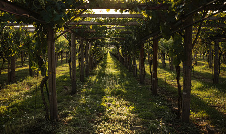 AI Generated. Lush vineyard rows under golden sunlight in the countryside during early evening hours