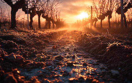 Sun-kissed vineyard practicing sustainable winemaking, with rows of budding grapevines. Dew on the grass captures the last rays of the sun, highlighting the eco-conscious approach to viticulture