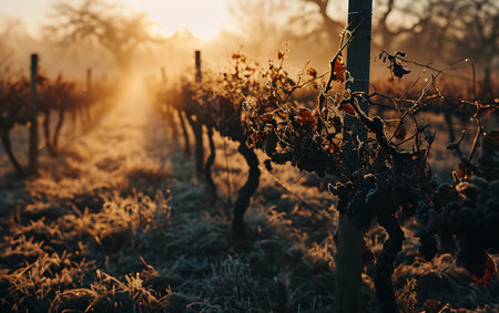 Beautiful autumn vineyard landscape with vibrant yellow and red leaves, showcasing misty morning atmosphere and frost-covered ground. Harvest and nature concept.